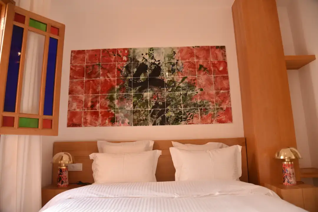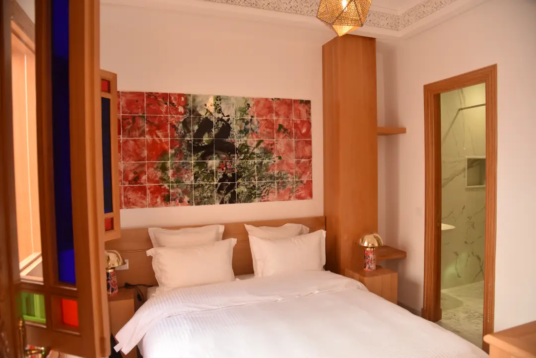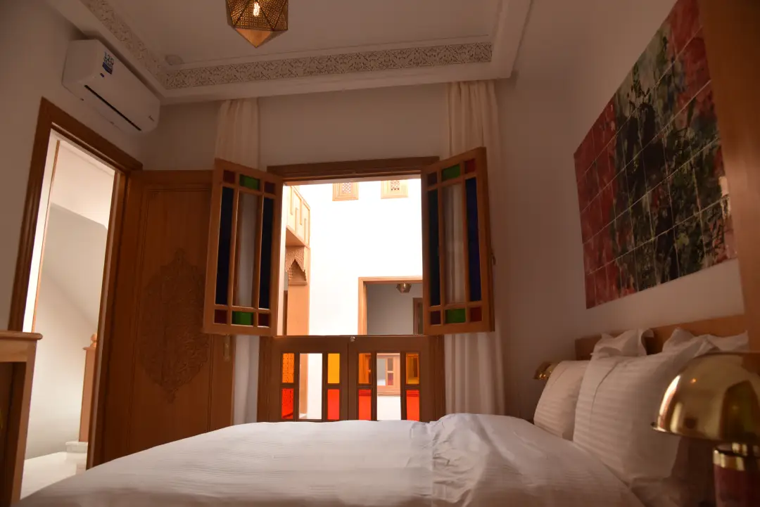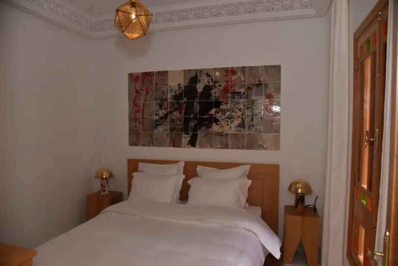Les couleurs sont sobres et chaleureuses, avec des tonalités terre, ocre et noir, créant une ambiance intime, propice au repos après une journée dans l’animation de Jemaa El Fna.
